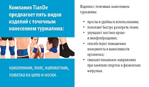 Изделия из турмалина пригодятся не только тем, кто уже столкнулся с неприятными ощущениями в области суставов, но и всем, кто находится в хорошей физической форме и ежедневно заботится о своем организме. На данный момент разработаны изделия с точечным нанесением турмалина в виде: наколенников, пояса, налокотников, повязки на шею и носков.