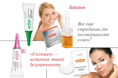 Серия Solution – это собрание инновационных косметических препаратов, направленных на решение ряда проблем кожи. Четыре средства от четырех проблем: против купероза, акне, пигментных пятен и «гусиных лапок». Особенность серии – самые современные формулы, удобные упаковки и высокая концентрация природных компонентов. Средства серии не относятся к базовому уходу, а служат его эффективным дополнением при наличии определенных проблем кожи.Средства Solution не имеют возрастных ограничений, с равным успехом могут применяться как молодыми, так и зрелыми женщинами. Благодаря высокой концентрации активных компонентов препараты Solution дают достаточно быстрые результаты при деликатном воздействии и отсутствии побочных явлений, обладают длительным эффектом. Все средства имеют инновационную упаковку, благодаря которой очень экономно дозируются, мало подвергаются вредному окислительному воздействию воздуха, удобны в примененении.