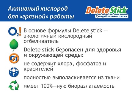 В его состав входит кристаллическая сода и перекись водорода, которые при соприкосновении с водой высвобождают активный кислород, способный связывать молекулы органических загрязнений и выводить их в воду.Delete Stick безопасный. Созданный на основе соды и водорода, он не содержит хлора, фосфатов, красителей и ионогенных ПАВ, вызывающих аллергические реакции и раздражения кожи. Средство полностью удаляется водой, а перекись водорода помогает уничтожить бактерии. Delete Stick экономичный. Небольшого объема пятновыводителя хватает на 500 применений. Пользуйтесь им каждый день, удаляйте пятна размером 2 на 3 см – в любом случае его хватит на 1,5 года. Delete Stick универсальный. Какова бы не была природа загрязнений, Delete Stick без труда справится с ними. Он подходит для удаления пятен как на неокрашенных, так и на цветных тканях. У этого пятновыводителя просто нет недостатков: достаточно 5-10 минут - и загрязнений как не бывало!